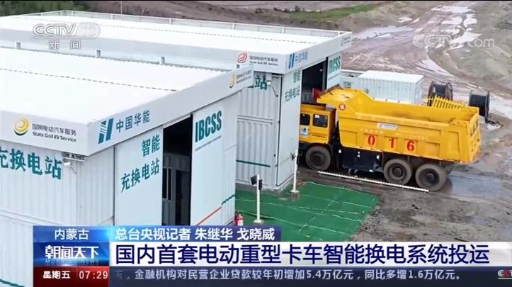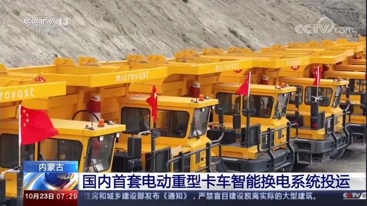 报道中,在内蒙古伊敏的露天矿31台电动重型卡车正在忙碌的作业着。两座智能充换电站每